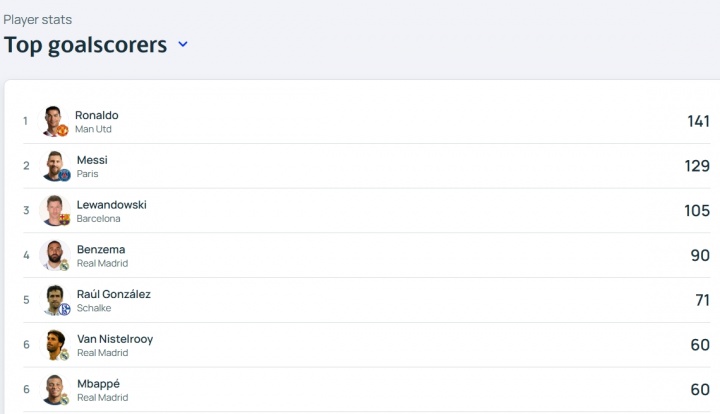 10月01日訊 皇馬5-0大勝凱拉特,姆巴佩上演帽子戲法。至此,26歲的姆巴佩在歐冠已經打進60球,位列歐冠歷史射手榜第6位。歐冠歷史射手榜:1:C羅141球2:梅西129球3:萊萬105球4:本澤馬90球5:勞爾71球6:姆巴佩60球