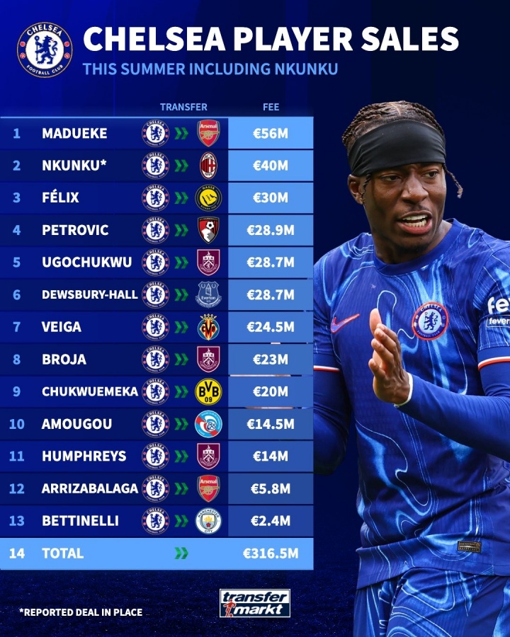 08月28日訊 據多家媒體消息,恩昆庫即將以超過4000萬歐元轉會費加盟米蘭,據德轉統計,切爾西今夏賣人總收入將達到3.165億歐元,冠絕全歐,比賣人榜第二位的伯恩茅斯多了近8000萬歐元。