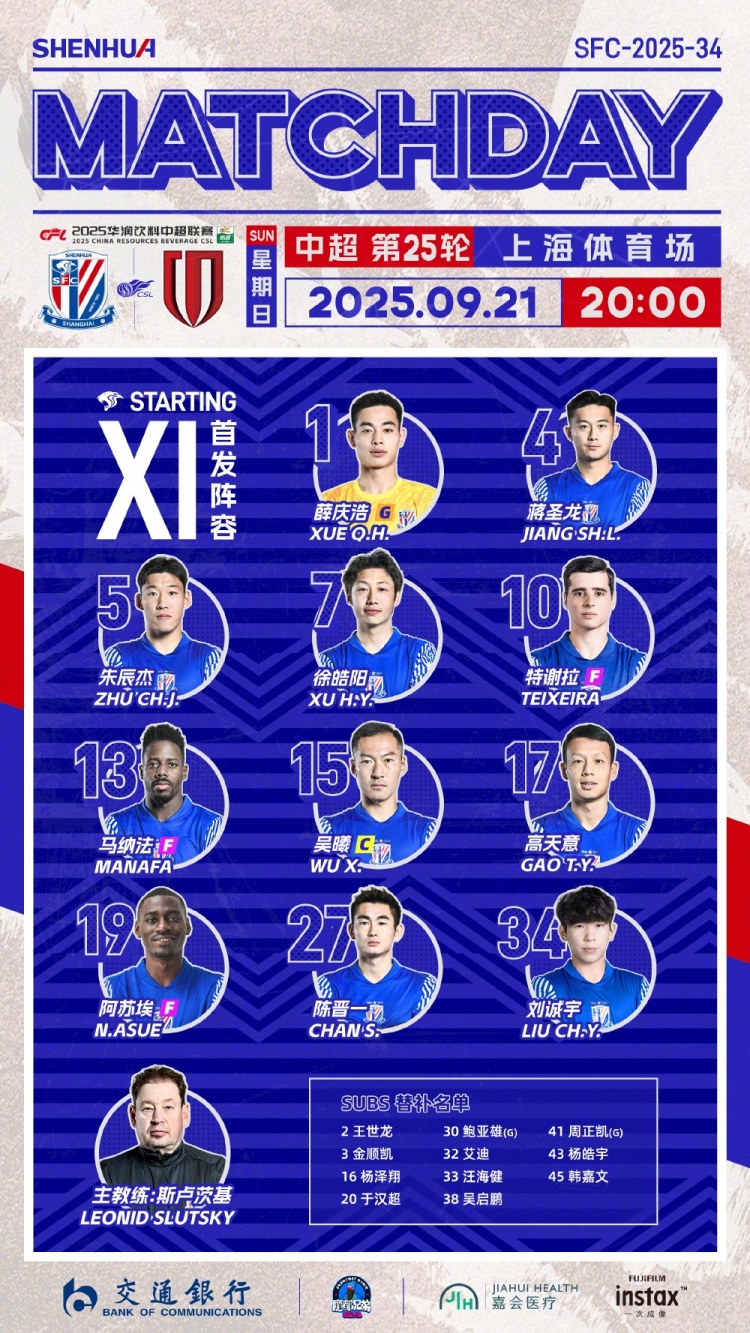 聯賽第25輪 上海申花 vs 成都蓉城 首發名單 ???